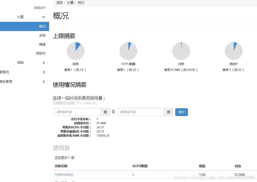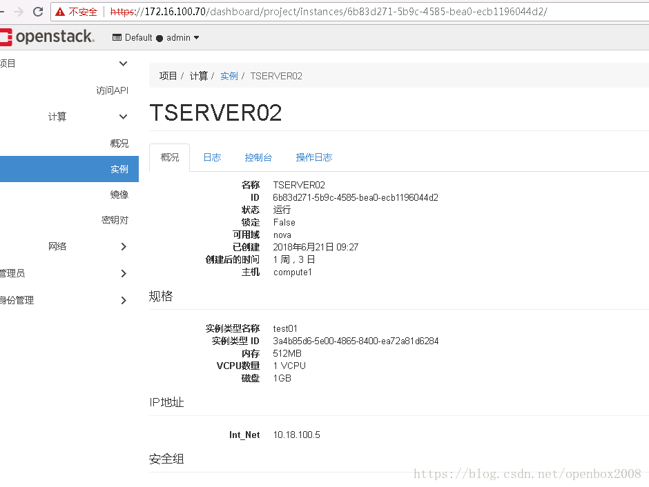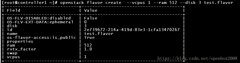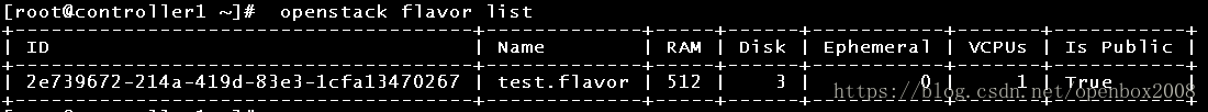 [root@controller1 ~]#openstack flavor create –vcpus 1 –ram 512 –disk 3 test.flavor #1cpu,512M内存 ,3G磁盘