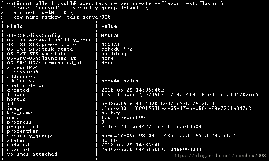 [root@controller1 ~]# openstack server create –flavor test.flavor