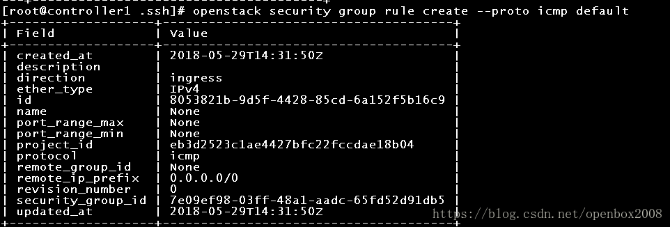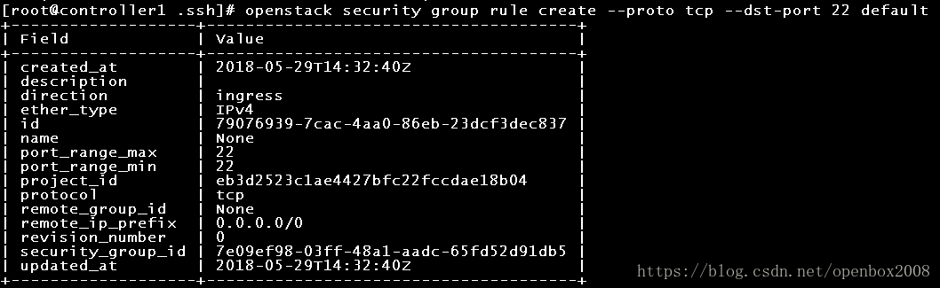 [root@controller1 .ssh]#openstack security group rule create –proto tcp –dst-port 22 d80b74d2-c89f-49d9-a2cf-4b1adc18af4d
