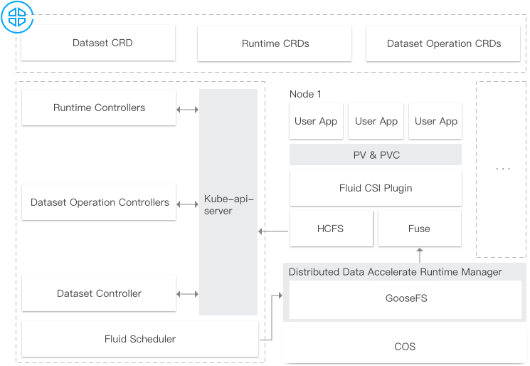 在 Fluid v0.6 中,来自腾讯云的社区贡献者基于该框架开发了 GooseFS Runtime,新增了一种支撑 Fluid Dataset 数据管理和缓存的执行引擎实现。用户可以在 Fluid 中通过 GooseFS Runtime 使用 GooseFS 缓存能力访问和缓存腾讯云 COS 中的文件,可以实现数倍加速业务访问。