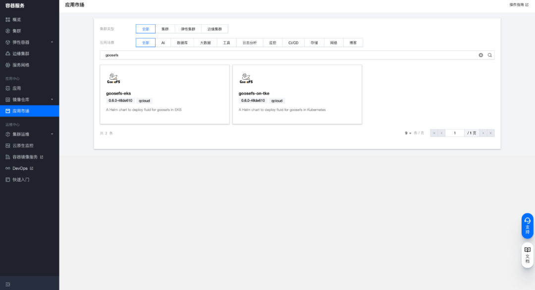 腾讯云容器服务 TKE和EKS 为快速部署 GooseFS 提供了便捷易用的途径,用户只需要在应用市场上选择 GooseFS 应用,为对应集群快速创建并部署应用即可在 Fluid 上使用和部署 GooseFS Runtime 。