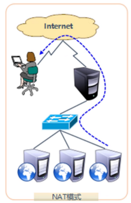 类似于防火墙的私有网络结构,负载调度器作为所有服务器节点的网关结构,负载调度器作为所有服务器节点的网关,即作为客户机的访问入口,也是各节点回应客户机的访问出口