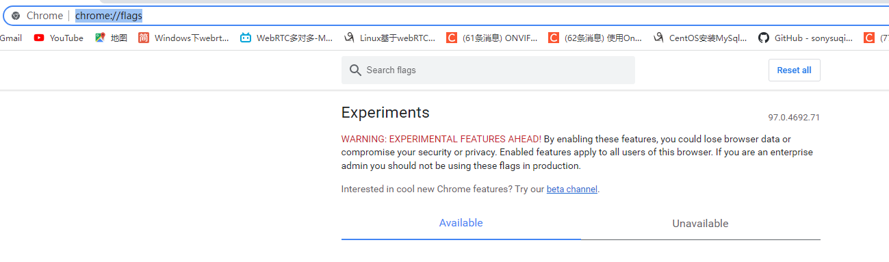 首先 chrome浏览器上输入 chrome://flags/ 回车后网页页面如下图所示。