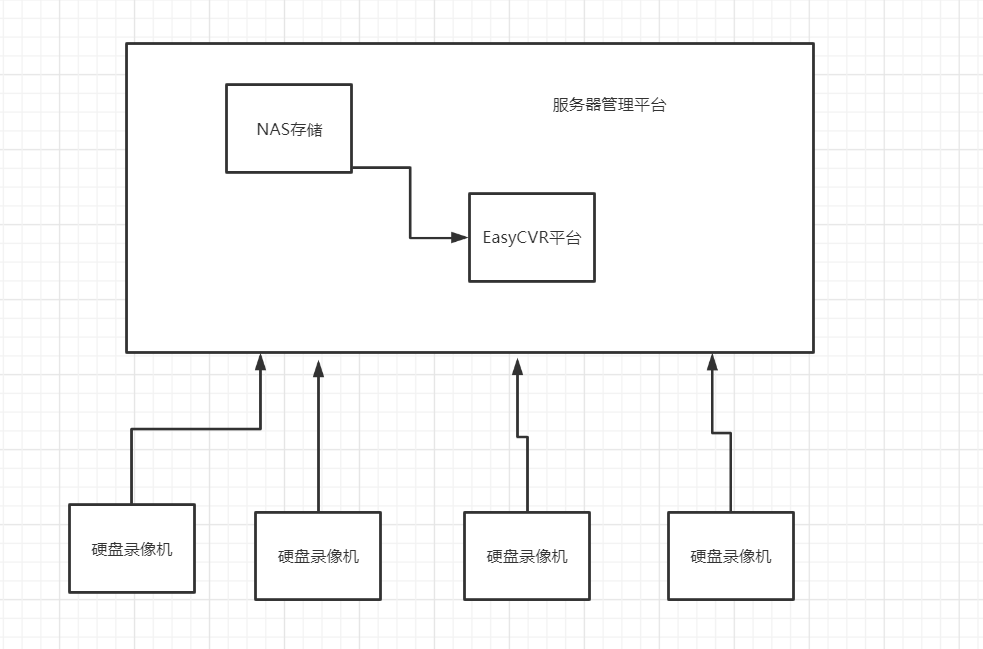在我们新的存储方式下,服务管理平台只是用于接入具体的硬盘录像机,同时获取EasyCVR硬盘录像机的录像和视频直播,中心服务平台主要用于视频直播接入和流转发,不做存储。结构大致如下: