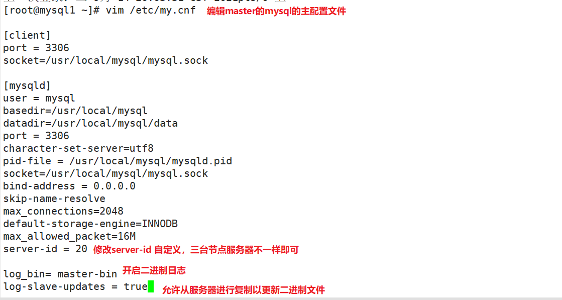 vim /etc/my.cnf [mysqld] server-id = 20 log_bin = master-bin log-slave-updates = true systemctl restart mysqld ln -s /usr/local/mysql/bin/mysql /usr/sbin/ ln -s /usr/local/mysql/bin/mysqlbinlog /usr/sbin/