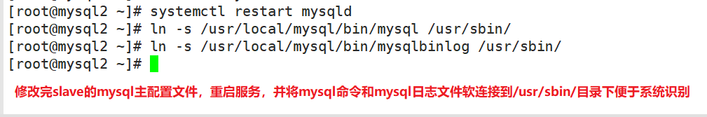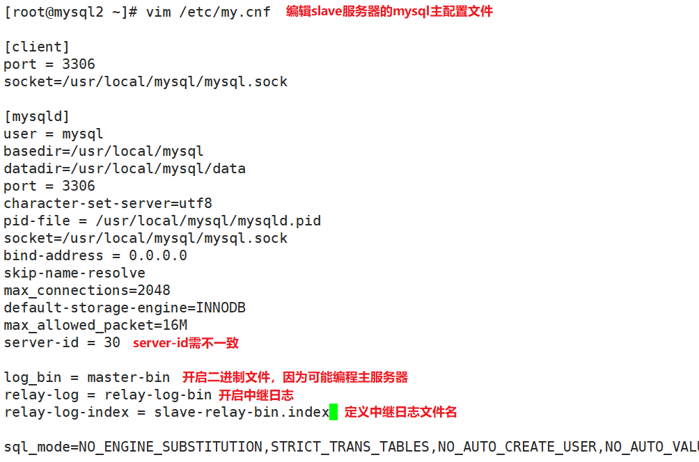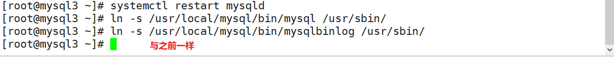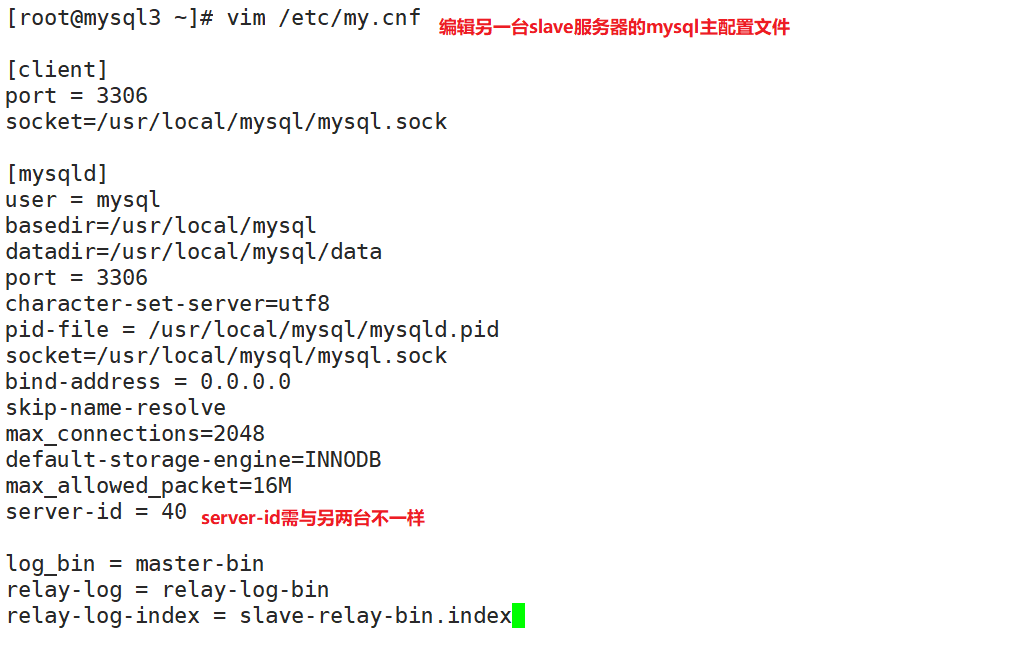 vim /etc/my.cnf server-id = 30 #server-id = 40 mysql3则为40,三台服务器 server-id 不能一样 log_bin = master-bin relay-log = relay-log-bin relay-log-index = slave-relay-bin.index systemctl restart mysqld ln -s /usr/local/mysql/bin/mysql /usr/sbin/ ln -s /usr/local/mysql/bin/mysqlbinlog /usr/sbin/