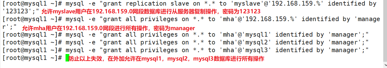 mysql -e "grant replication slave on *.* to 'myslave'@'192.168.159.%' identified by '123123';" mysql -e "grant all privileges on *.* to 'mha'@'192.168.159.%' identified by 'manager';" mysql -e "grant all privileges on *.* to 'mha'@'mysql1' identified by 'manager';" mysql -e "grant all privileges on *.* to 'mha'@'mysql2' identified by 'manager';" mysql -e "grant all privileges on *.* to 'mha'@'mysql3' identified by 'manager';"