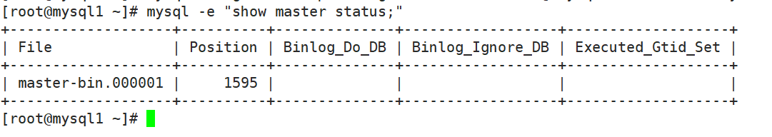 +-------------------+----------+--------------+------------------+-------------------+ | File | Position | Binlog_Do_DB | Binlog_Ignore_DB | Executed_Gtid_Set | +-------------------+----------+--------------+------------------+-------------------+ | master-bin.000001 | 1595 | | | | +-------------------+----------+--------------+------------------+-------------------+
