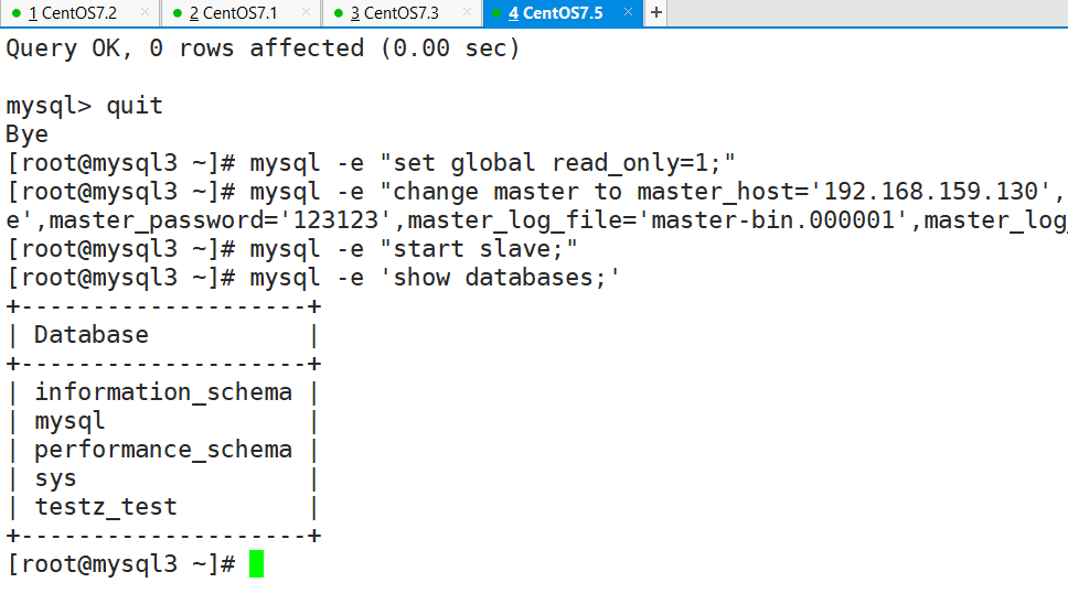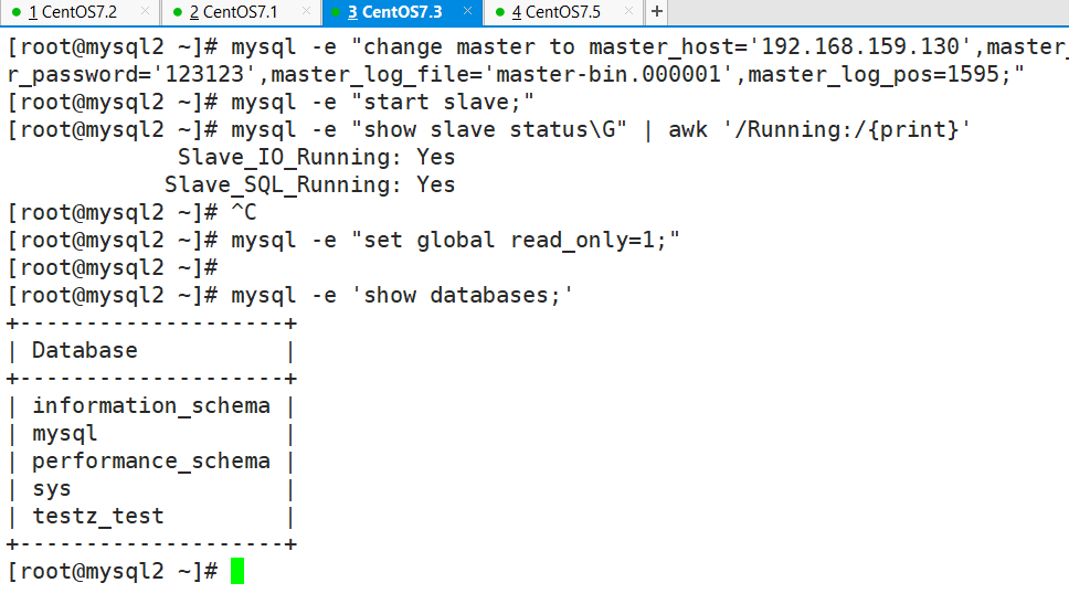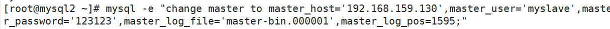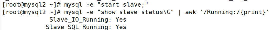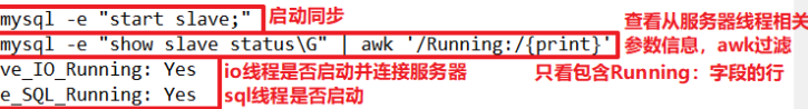 mysql -e "change master to master_host='192.168.159.130',master_user='myslave',master_password='123123',master_log_file='master-bin.000001',master_log_pos=1595;" mysql -e "start slave;" mysql -e "show slave statusG" | awk '/Running:/{print}'