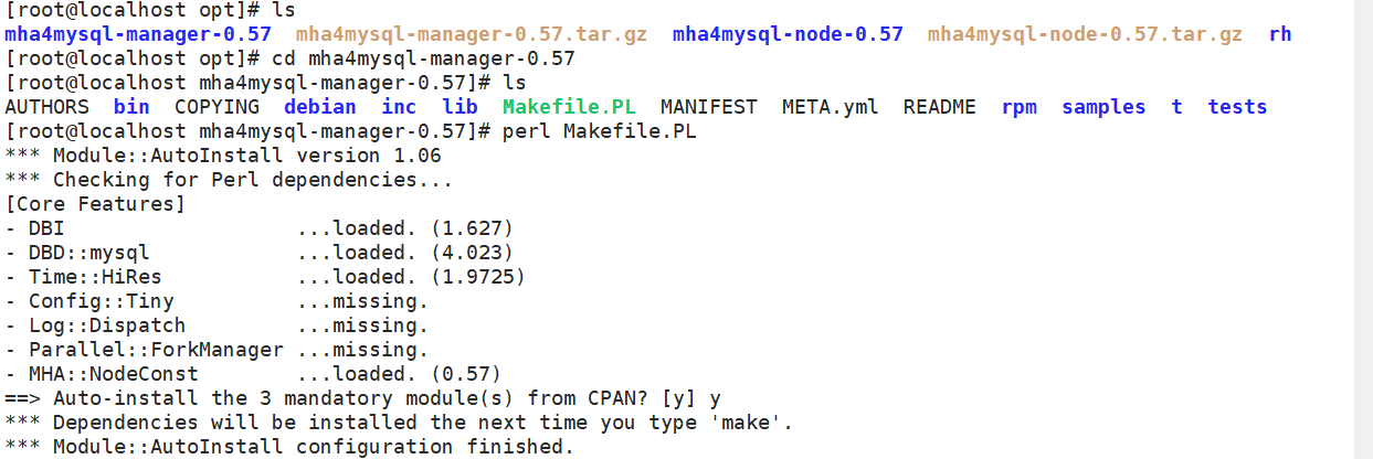 cd /opt tar zxvf mha4mysql-manager-0.57.tar.gz cd mha4mysql-manager-0.57 perl Makefile.PL make && make install
