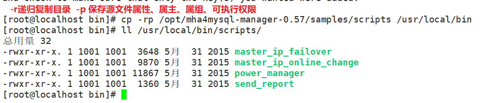 cp -rp /opt/mha4mysql-manager-0.57/samples/scripts /usr/local/bin #复制后会有四个执行文件 ll /usr/local/bin/scripts/