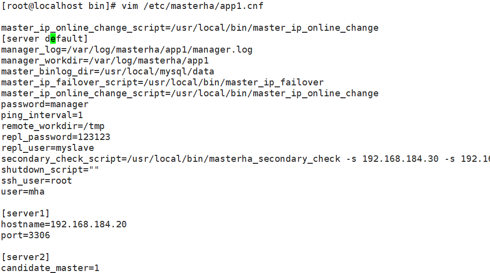 echo '' > /etc/masterha/app1.cnf vim /etc/masterha/app1.cnf
