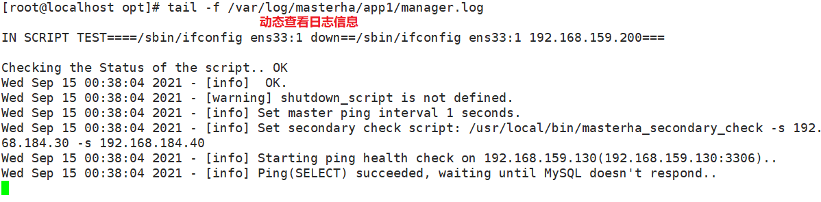 查看 MHA 日志,也以看到当前的 master 是 192.168.159.130,如下所示。