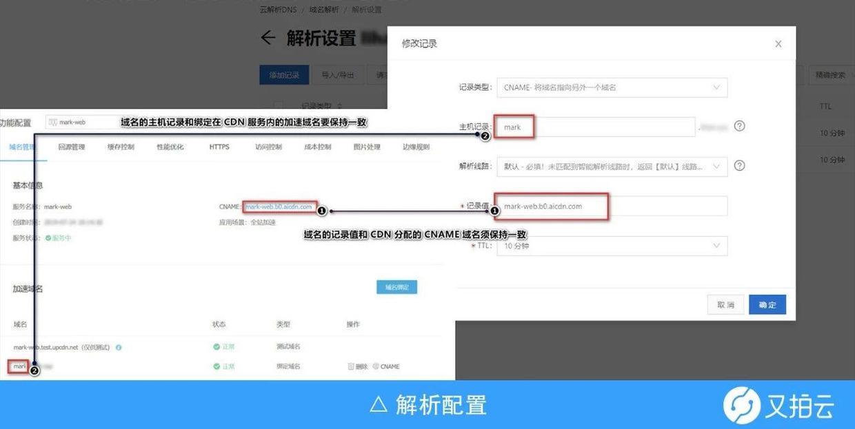 CNAME 域名配置在 CDN 的域名需要用到 CNAME 域名来配置 CNAME 解析,在又拍云控制台配置完成CDN 服务后,开发者会得到一个 CNAME 域名(该域名一定是 *.http://b0.aicdn.com,其中 * 处就是开发者的 CDN 服务名), 用户需要将绑定在 CDN 的加速域名做 CNAME 解析,解析地址就是这个 CNAME 域名,这样,当用户访问加速域名的时候,所有的请求都会指向又拍云 CDN 服务,从而实现加速效果。