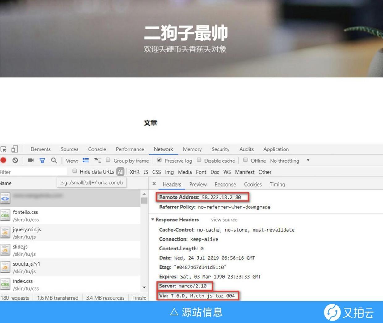 打开浏览器的控制台,远程地址已经不是自己源站的 IP 信息了,Server 响应头的值说明响应来自于 CDN 的节点。