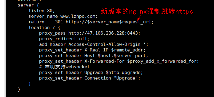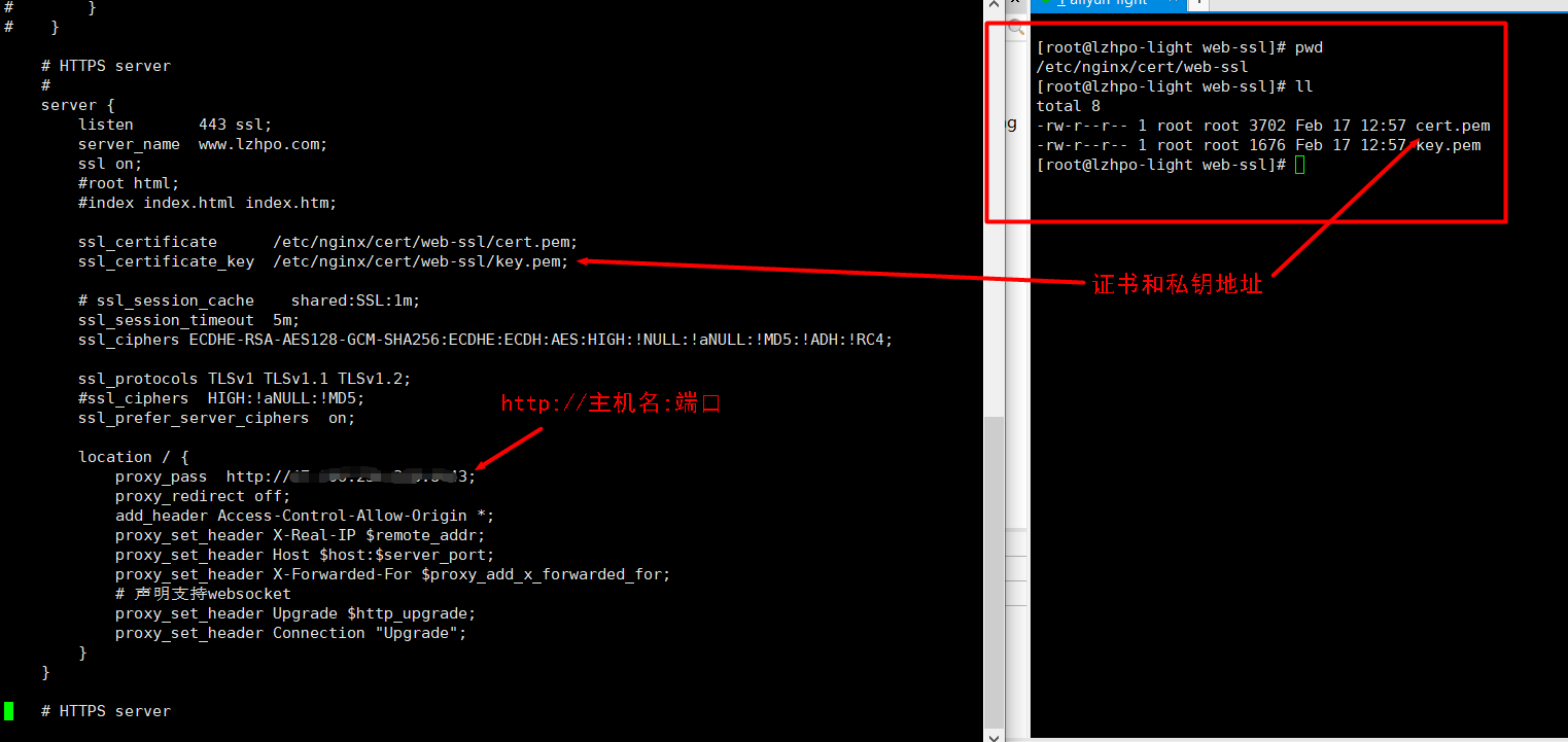 # HTTPS server server { listen 443 ssl; server_name www.lzhpo.com; ssl on; #root html; #index index.html index.htm; ssl_certificate /etc/nginx/cert/web-ssl/cert.pem; ssl_certificate_key /etc/nginx/cert/web-ssl/key.pem; # ssl_session_cache shared:SSL:1m; ssl_session_timeout 5m; ssl_ciphers ECDHE-RSA-AES128-GCM-SHA256:ECDHE:ECDH:AES:HIGH:!NULL:!aNULL:!MD5:!ADH:!RC4; ssl_protocols TLSv1 TLSv1.1 TLSv1.2; #ssl_ciphers HIGH:!aNULL:!MD5; ssl_prefer_server_ciphers on; location / { proxy_pass http://ip地址:端口; proxy_redirect off; add_header Access-Control-Allow-Origin *; proxy_set_header X-Real-IP $remote_addr; proxy_set_header Host $host:$server_port; proxy_set_header X-Forwarded-For $proxy_add_x_forwarded_for; # 声明支持websocket proxy_set_header Upgrade $http_upgrade; proxy_set_header Connection "Upgrade"; } }