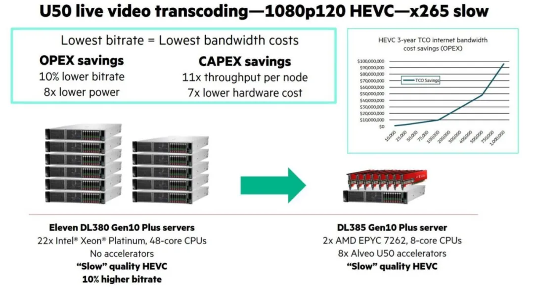 赛灵思与 HPE 携手提供最高系统级性能。通过详细的工作负载配置,能够确保在主机 CPU 和 Alveo 加速器卡之间进行智能功能分区。从 CPU 卸载编码器功能可确保处理器能够为音频处理和广告插入等其他关键任务提供支持。对 FFmpeg 插件的支持有助于客户将 Alveo U50 加速器卡和软件轻松集成到现有基础设施中。标准的命令行窗口也提供了全面控制。