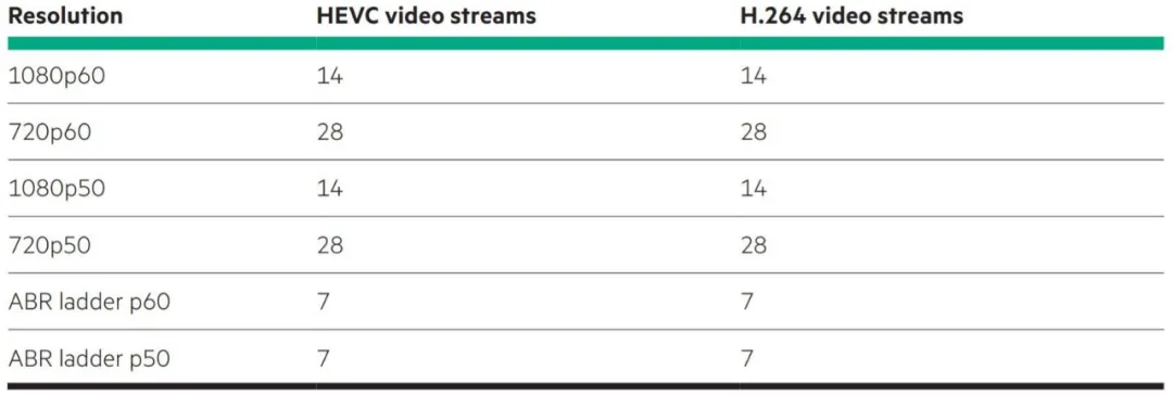 服务器配置了 7 个 U50 用于编码、1 个 U50 用于 H.264 解码和缩放,能够支持视频流分辨率和全部 ABR 阶梯,如下表所示: