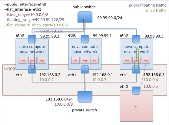 上面提到的Flat DHCP Network是Nova-Network服务的一种模式。另外还有Flat,VLan等,这里就不一一介绍了。Flat DHCP指的是所有虚拟机处在同一个平坦的网段上,且DHCP服务自动为其分配IP。