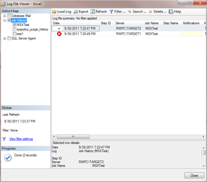 现在,在你的TSX服务器运行作业。等待一分钟左右,然后回到你的主服务器,右击MSXTest作业,选择查看历史记录。现在你会注意到从每个TSX服务器的历史反馈回来(注意在日志文件查看器中的Server列),如插图11所示。