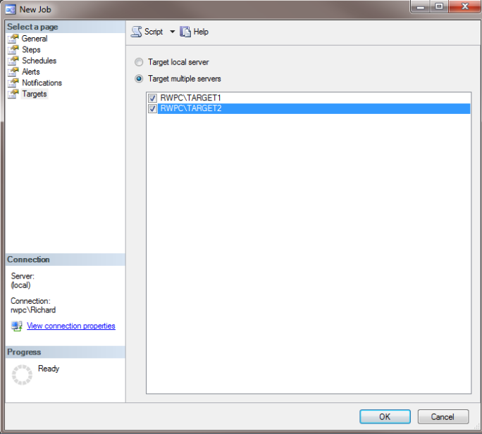 现在你已经配置完环境,是时候来创建一个主作业,将运行在所有的服务器上,并报告状态给你的主服务器。主服务器上创建一个新的作业,只有简单步骤(T- SQL类型select * from sys.all_objects)。点击目标选项卡(插图9所示),并选择两个目标服务器。单击“确定”,作业在主服务器上创建完成。
