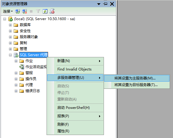 建立MSX/TSX的最简单的方法是使用主服务器向导。右键单击您的SQL Server代理节点,选择多服务器管理->将其设置为主服务器…(如插图1所示)