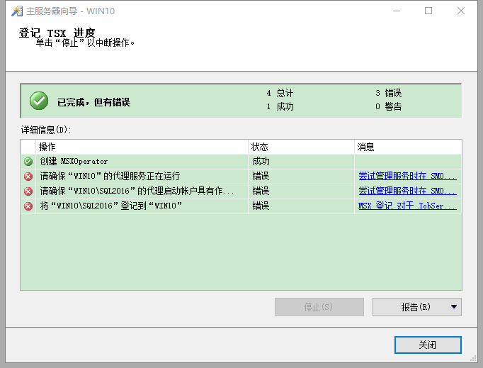 点 击下一步,完成,你应该看到类似插图7的向导完成后,你的默认实例为主服务器,另外两个实例作为目标服务器。你可能会得到与登录创建错误,如图插图7所示。如果发生这种情况,只要登记进程成功你就可以忽略错误。错误可能仅仅意味着 服务帐户已配置。