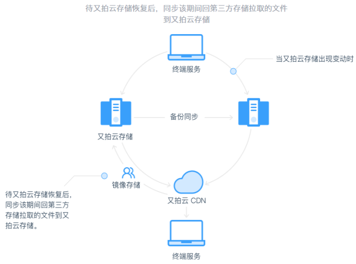 虽然同时使用多家云存储的成本并不高,但是对应用系统产生不小的技术成本,甚至很难做好这个融合工作。目前最简单的方法就是在 CDN 服务上做多源站的容灾处理在 CDN 访问过程中回源到 A 云存储无法正常服务时,自动切换到 B 云存储。但后续还有不少工作,比如应用存储文件到 A 后还得写个队列同步到 B,如果 A 故障那么会只写到 B,等 A 恢复后哪些文件要重新同步回来等等。这个时候又拍云的融合云存储整体解决方案就能帮助大家很好的解决这些问题。