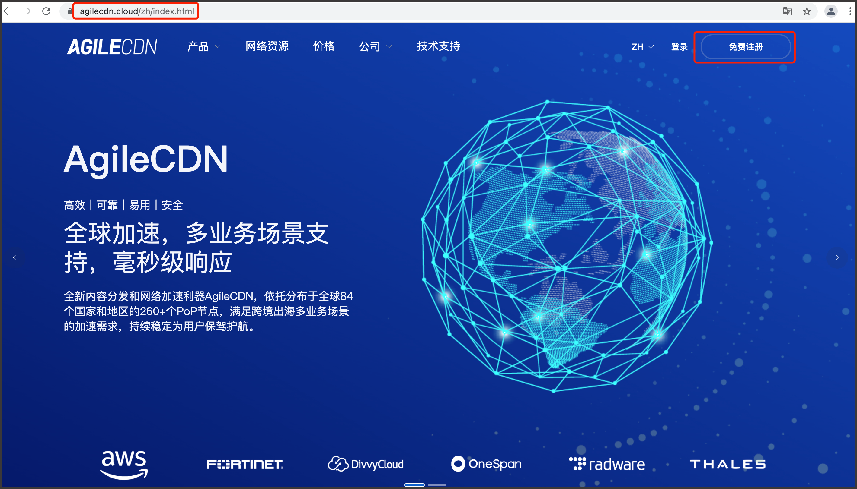在AgileCDN官网点击【免费注册】,在注册页完善信息后点击【创建账户】,在您的注册邮箱内根据邮件指引激活账号即可。获得账号密码后,登录到AgileCDN控制台界面。