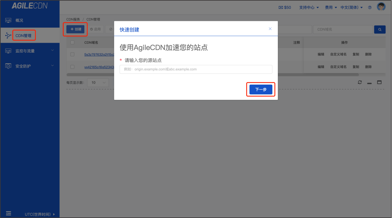 在【CDN管理】板块中,点击左上角【创建】输入源站点,大约10分钟后,CDN域名将会完成全球260+超级节点的部署,您可以直接点击新生产的CDN域名进行访问。
