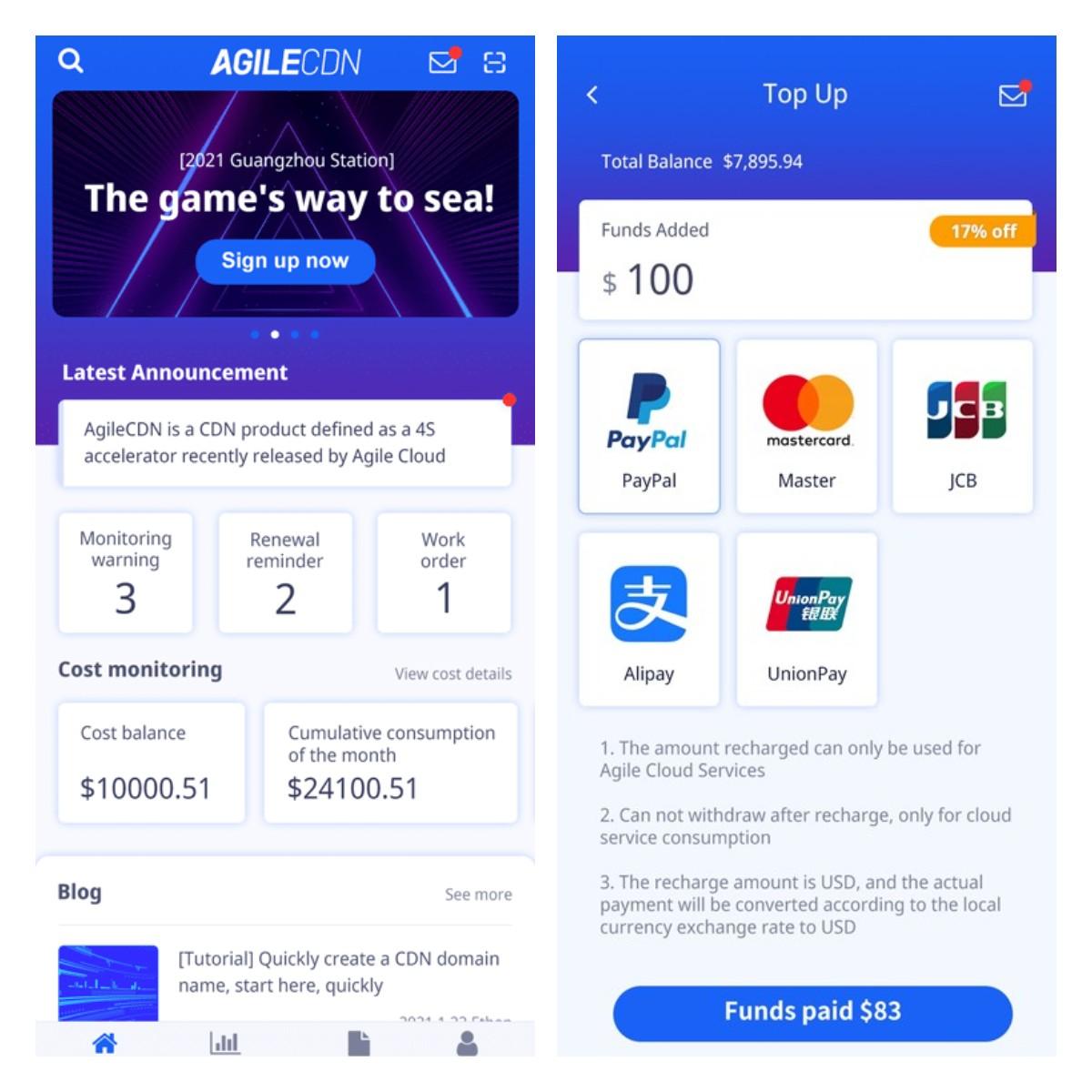 AgileCDN APP上线,用户在移动端也能轻松实现流量监控、账号管理、快捷支付等操作。