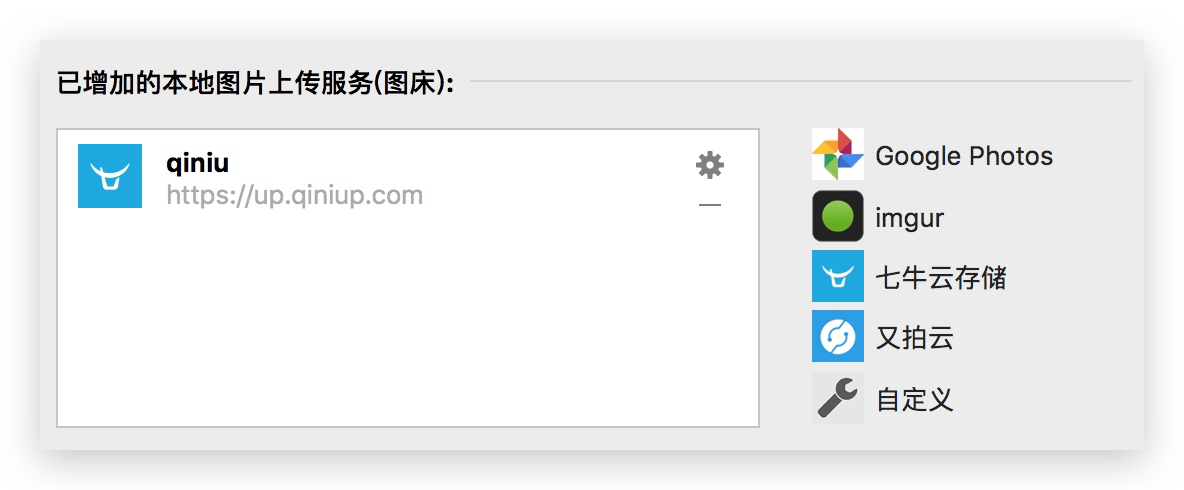 mweb支持上传的图床有Google Photos, imgur, 七牛云存储,又拍云和自定义,竟然不支持微博和github,那只能用七牛云存储了。