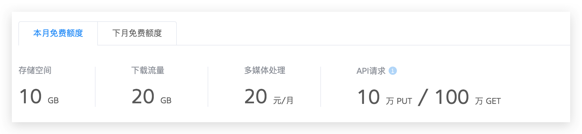 七牛云一个月赠送10G存储空间,20G下载流量,10w的put和100w的getAPI请求次数。对于一个访问量不大的网站,这些赠送的额度是绰绰有余的。
