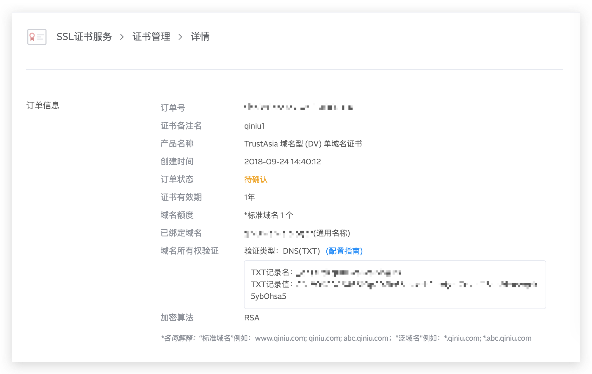 以阿里云为例,添加一条记录,选择TXT记录类型,填入七牛云给的TXT记录名和TXT记录值