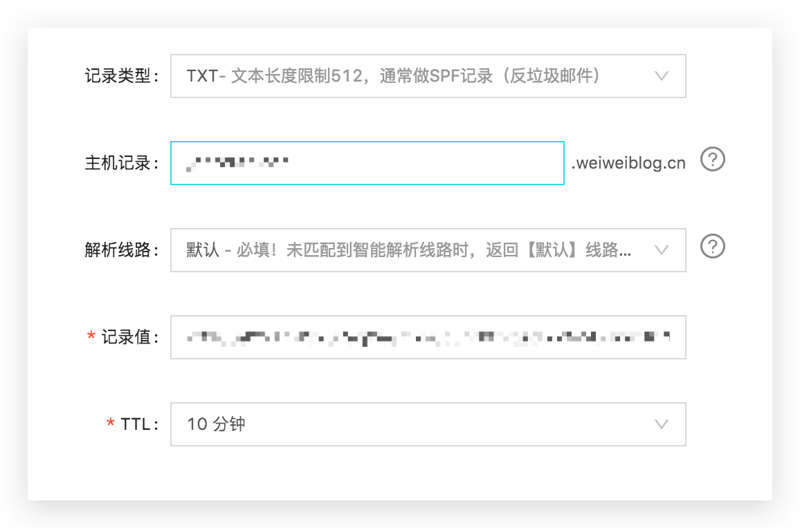 这时候就需要去你的域名管理商那边添加一条TXT记录,进行域名验证。