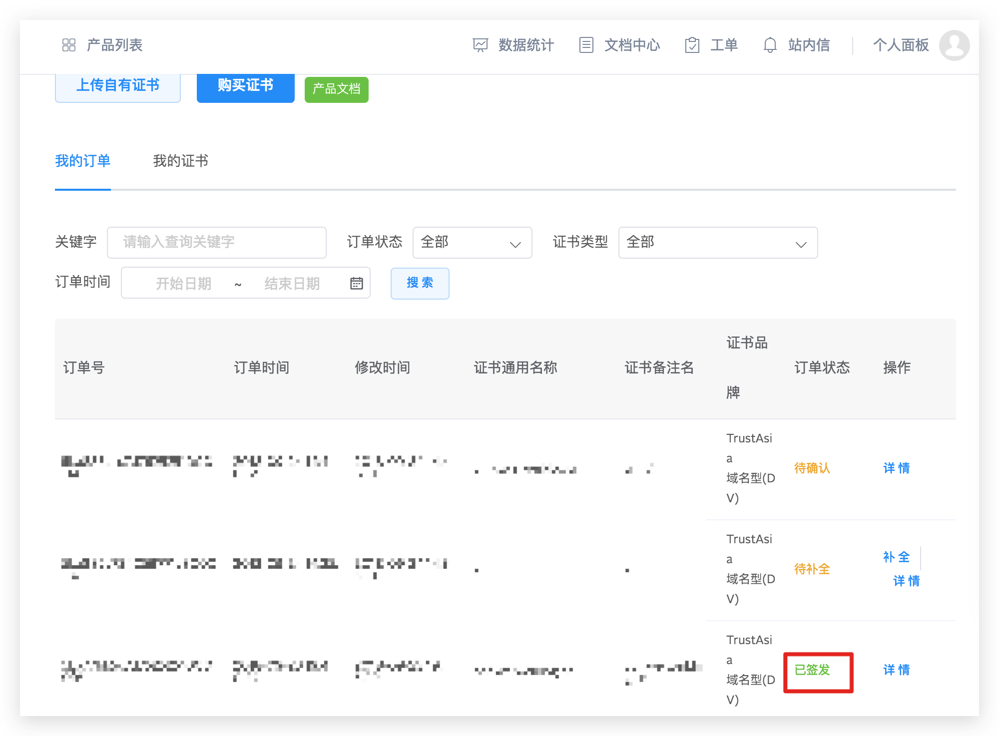 过几分钟,等待验证通过,订单状态就会变成已签发。