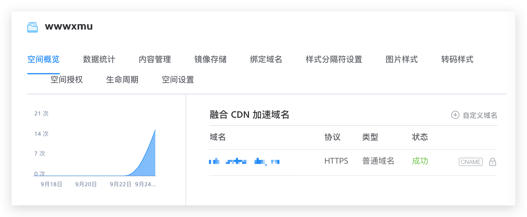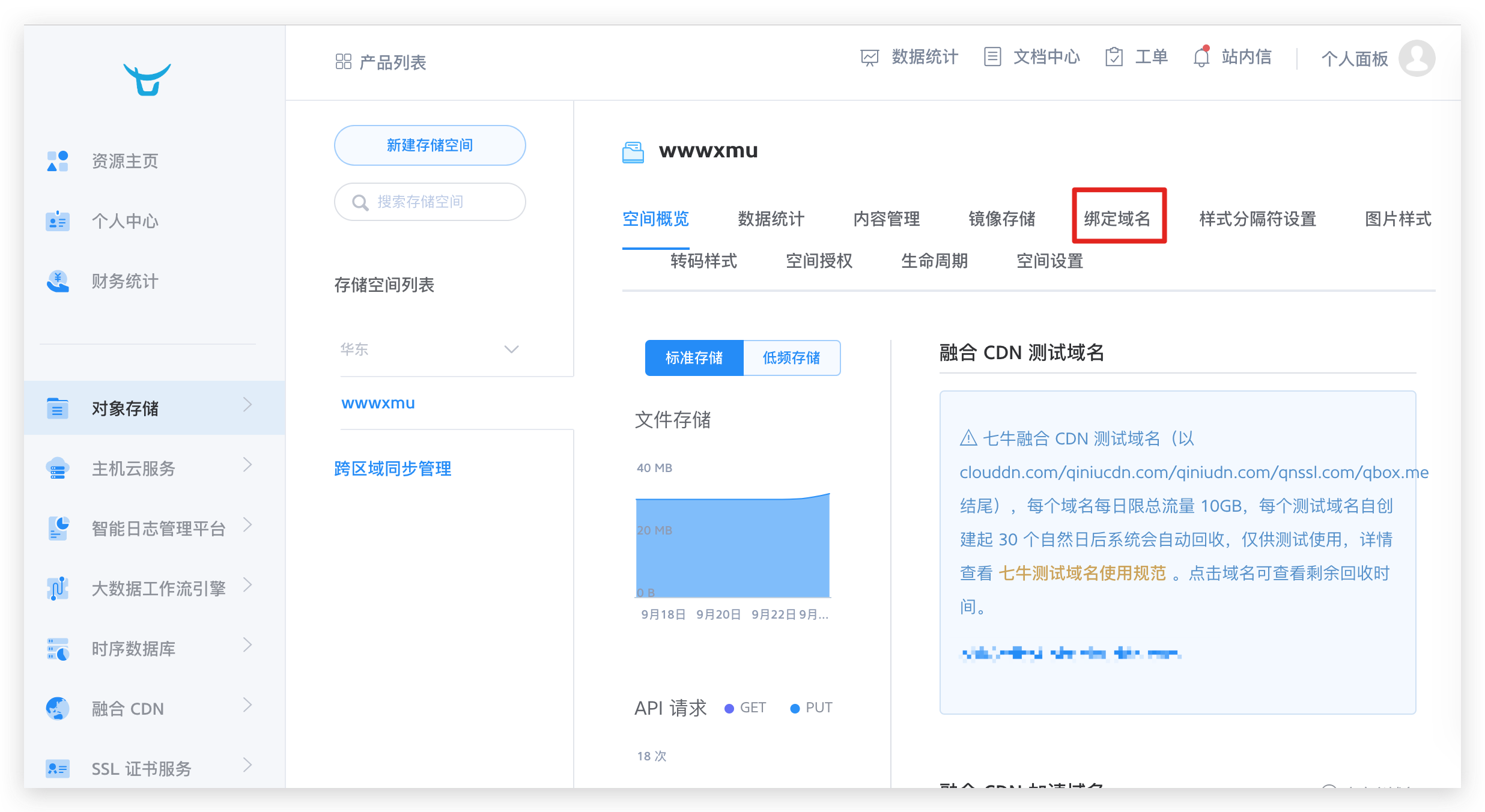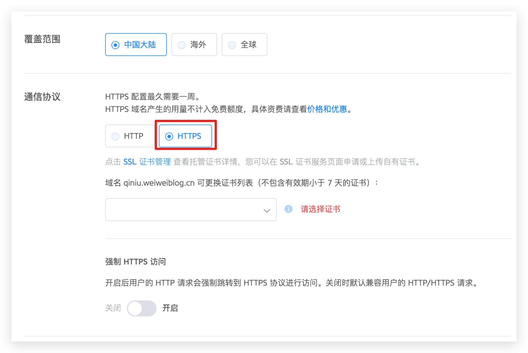 之前已经在七牛云上创建过一个存储空间了,但是它分配的是一个测试域名,还不支持HTTPS,而我的网站已经全站支持HTTPS了,所以之前那个测试域名我是不想用了,必须自己再绑定一个域名,设置通信协议为HTTPS。步骤如下:
