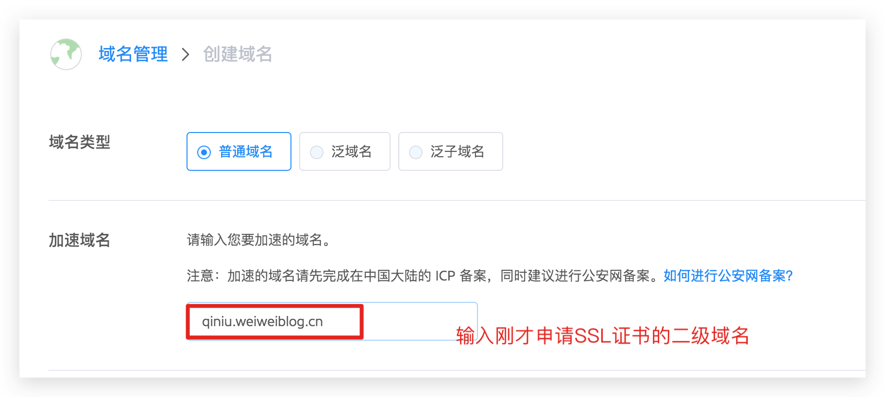这边我用的是qiniu.weiweiblog.cn这个二级域名,因为www.weiweiblog.cn已经用到我的网站上了,你可以根据你的实际情况填写