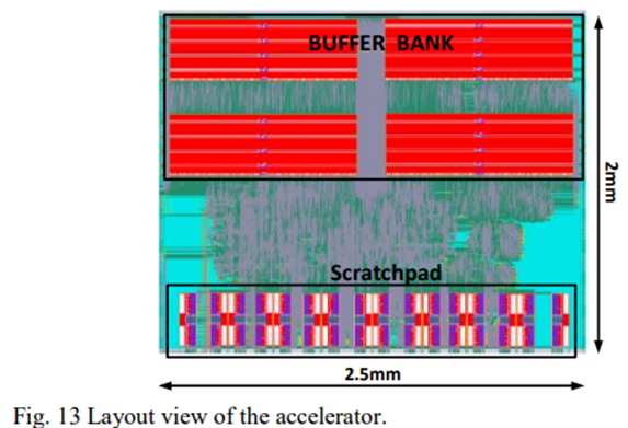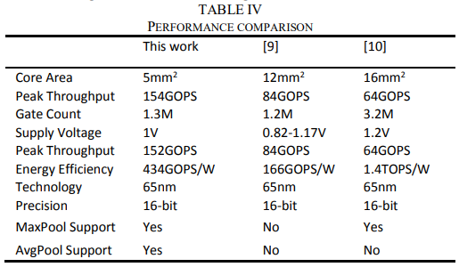 表四是所设计加速器与现有加速器的比较其他报告的工作。如图所示,该加速器以较低的面积成本实现了高能效和可比性能,适合集成到物联网设备中。