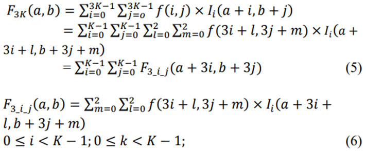 在这里𝐹3.𝐾(𝑎,𝑏) 表示内核大小为3K的过滤器,左上角的权重与图像中位置(a,b)处的像素值相乘。过滤器中的每个权重表示为𝑓(𝑖,𝑗) 在哪里,(𝑖,𝑗) 表示权重相对于过滤器内左上角权重的位置,𝐼𝑖(𝑎+3.𝑖+𝑙,𝑏+3.𝑗+𝑚) 表示图像像素在(𝑎+3.𝑖+𝑙,𝑏+3.𝑗+𝑚) 在图片中。𝐹3_𝑖_𝑗 表示K2的不同3×3内核大小的过滤器,计算函数定义为(6)。此外,3𝑖 和3𝑗 可以表示为每个3×3过滤器的移位地址。