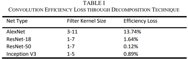 表一是使用这种分解技术,对不同主要CNN网络效率损失的比较。