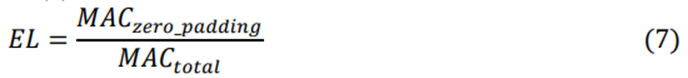 这是𝑀𝐴𝐶𝑡𝑜𝑡𝑎𝑙 表示引擎计算CNN网络所需的总乘法-累加运算,𝑀𝐴𝐶𝑧𝑒𝑟𝑜_𝑝𝑎𝑑𝑑𝑖𝑛𝑔 表示用于计算零填充部分的MAC操作。例如,一个11×11过滤器实际上有23/144 MAC操作用于计算零填充部分,导致效率损失16%。