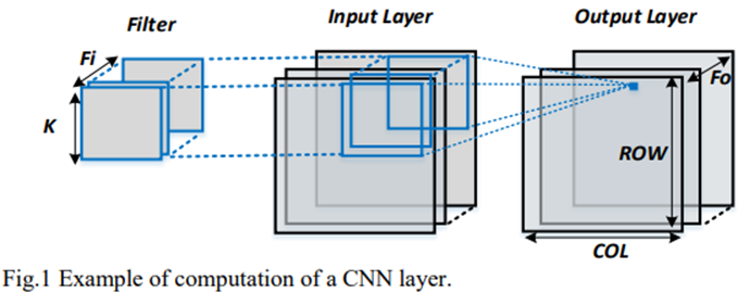 根据上述参数的定义,输入层𝐹𝑖 频道。每个通道的宽度是𝐶𝑂𝐿×𝑠 身高是𝑅𝑂𝑊×𝑠. 图层输出包括𝐹𝑜 特征。每个特征的宽度是𝐶𝑂𝐿,高是𝑅𝑂𝑊. 过滤器编号与输出特征编号相同。在每个过滤器中,都是通过𝐹𝑖 分离的过滤器窗口。每个窗口的内核大小为K。整个卷积过程如图1所示。