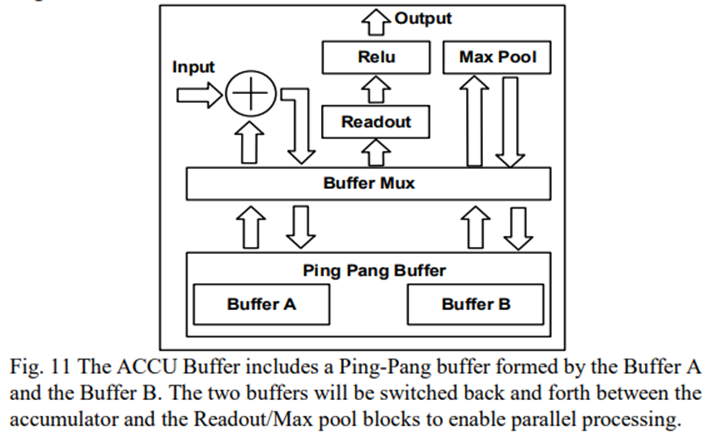 ACCU缓冲区包括一个乒乓缓冲区作为scratchpad行,一个累加器用于对部分结果求和,一个单独的池块用于最大池,以及一个读出块,用于将数据从scratchpad行读回缓冲bank。