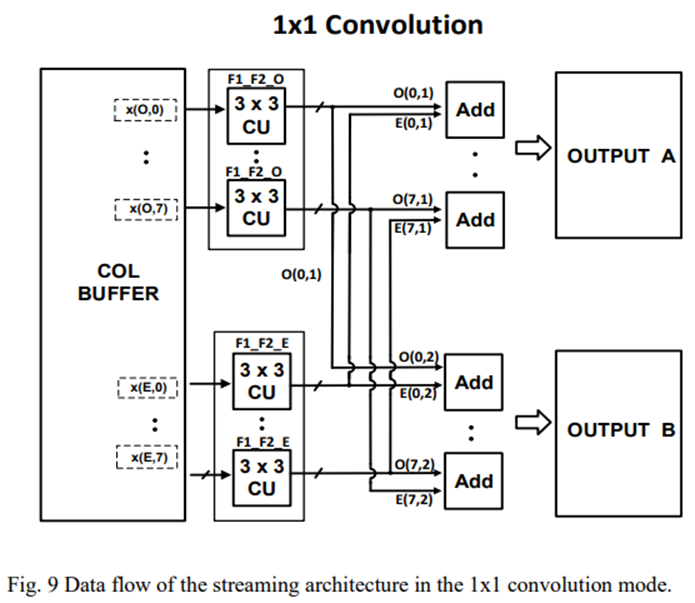 为了防止这种情况,提出了一种交织结构,将16个输入数据分为偶数信道数据和奇数信道数据。这两组数据分别与两个不同特征的权重相乘,在CU引擎输出端总共得到32个数据(两个输出特征的部分结果)。然而,由于32个数据流是从两个不同的通道生成的,因此CU输出端需要一个求和函数组合,来自不同通道的相同特征的部分结果。通过这样做,数据带宽减少了一半,加法器的最终输出将与输入数据带宽相同。该功能的详细实现如图9所示。这里是X(O,0)⋯X(O,7)代表奇数通道的第1至第8行数据,X(E,0)⋯X(E,7)表示偶数个通道的第1到第8行数据。O(0,1),E(0,1)是奇数和偶数通道的第一特征部分结果,O(0,2),E(0,2)是奇数和偶数通道的第二特征部分结果。
