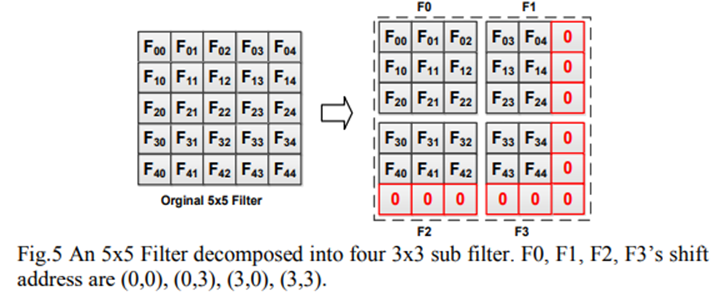为了最大限度地减少硬件资源的使用,提出了一种滤波器分解算法,通过仅使用3×3大小的CU,计算任意大的内核大小(>3×3)的卷积。该算法首先检查过滤器的内核大小。如果原始过滤器的内核大小不是3的精确倍数,将在原始过滤器的内核边界中添加零填充权重,将原始过滤器的内核大小扩展为3的倍数。由于边界中的附加权重为0,在计算过程中,扩展滤波器将产生与原始滤波器相同的输出值。将扩展的过滤器分解为几个3×3大小的过滤器。每个过滤器将根据左上角权重在原始过滤器中的相对位置,分配一个移位地址。例如,图4是将5×5滤波器分解为四个3×3滤波器的示例。在原始滤波器中添加一行和一列零填充。分解后的滤波器:F0、F1、F2、F3的移位地址为(0,0)、(0,3)、(3,0)、(3,3)。