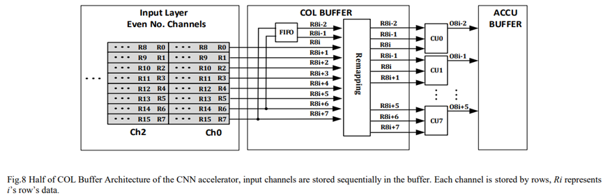 为了最大限度地利用缓冲bank的输出带宽,两行FIFO缓冲区与每组行数据配对,将八个输入行传输到十个重叠的输出行。使得为每组行数据并行运行八个3×3 CU。包括在COL缓冲器中的FIFO缓冲器,如图8所示。这里,只为偶数个通道的数据绘制一半大小的COL缓冲区。真正的实现包括奇偶通道的FIFO缓冲区。
