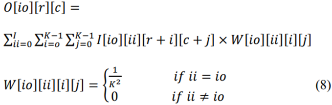 这里ii和io是输入通道号和输出特征号,r和c是输出特征的行和列号,W代表滤波器的权重。K是平均池窗口的内核大小。