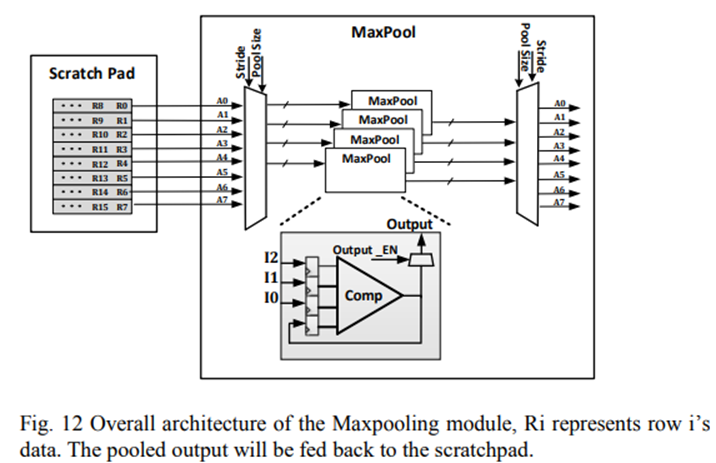 图12示出了最大池模块及其与scratchpad行的连接的总体架构。scratchpad并行存储来自一个输出特性的八行数据。八行数据共享一个列地址,可以同时访问。由于步幅大小在卷积中的差异,存储在scratchpad行中的数据可能无法全部验证。例如,当步幅等于2时,只有R0、R2、R4、R6存储验证数据。此外,池窗口的内核大小也可以配置为2或3。
