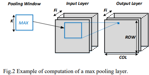除了卷积层,池层也是常规CNN的重要组成部分。池层的作用是从每个通道中的一组相邻图像像素中提取信息。通常,池层可以分为两类:最大池层和平均池层。最大池层选择池窗口内的最大图像数据值,平均池层提供池窗口内数据的平均值。这两个池操作的数学表示定义为(2)和(3)。每个输入通道分别合并,使图层的输入通道号等于输出特征号。图2是最大池功能的示例。